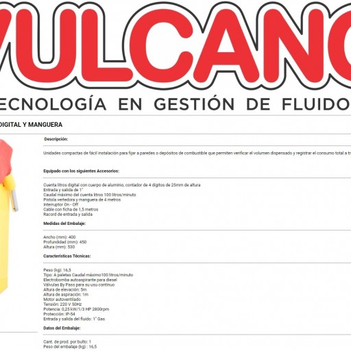 Electrobomba de Trasvase Para GAS-OIL (GASOIL) de 220V con Cuentalitros (Caudalímetro) Digital, Manguera y Pistola con Corte Automático Marca VULCANO EG157