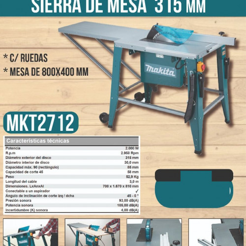 Sierra Circular Madera de Mesa (Pié-Banco) Para Uso en Obra/Carpintería Con Motor 3HP Marca MAKITA 2712