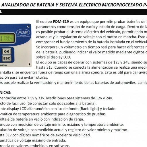 Analizador/Probador de Baterías y Sistema Eléctrico Autovoltaje 12/24v y Sistema Microprocesado Marca PDM-E19-PITARCH
