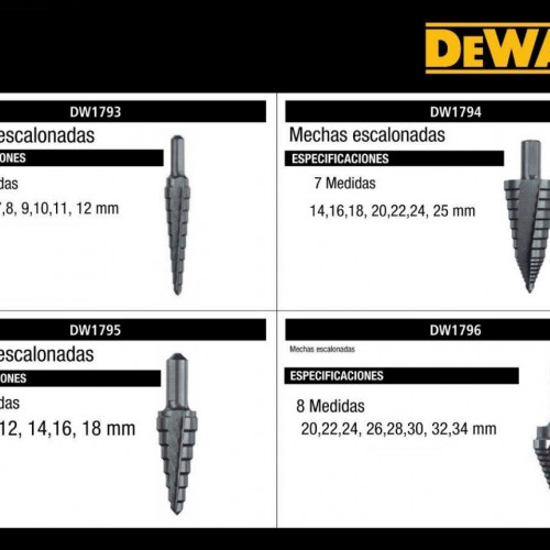 Mechas Escalonadas Cónicas Para Aceros Marca DeWALT DW1793-DW1794-DW1795-DW1796