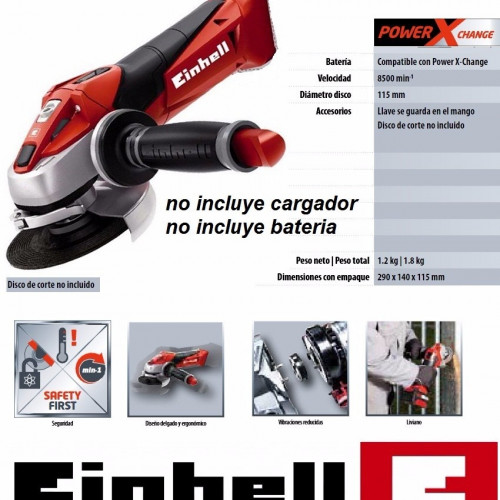 Amoladora Angular Inalámbrica Recargable Lithium 18v Marca EINHELL TE-AG 18Li