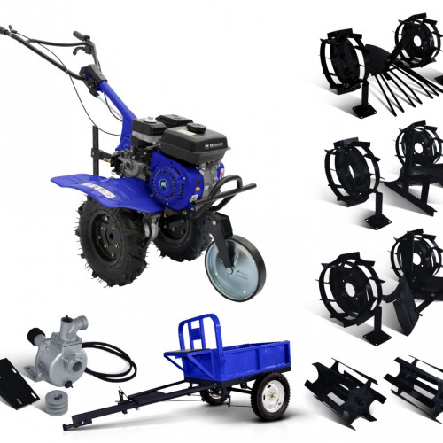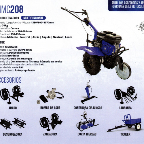 Motocultivador a Explosión (NAFTA) Multifunción con Implementos de Arado, Desmalezadora, Rotovator, Motobomba de Agua y Tráiler Marca MOTOMEL MMC208 6,5HP