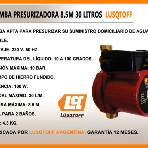 Bomba Presurizadora Para Tanque De Agua Domiciliario Con Capacidad de Hasta Dos Baños En 8,5mts Marca LÜSQTOFF LPS1585-LPS4013