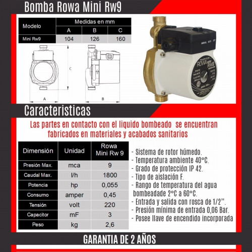 BOMBA PRESURIZADORA DE AGUA CON CABEZAL Y ROTOR DE BRONCE DOMICILIARIA AUTOMÁTICA MARCA ROWA MINI RW9